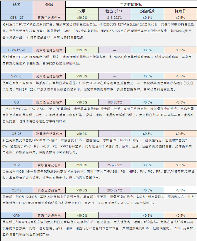 熒光增白劑可以吸收不可見(jiàn)的紫外光(波長(zhǎng)范圍約為60—380nm),轉(zhuǎn)換為波長(zhǎng)較長(zhǎng)的藍(lán)光或紫色的可見(jiàn)光,因而可以補(bǔ)償基質(zhì)中不想要的微黃色,同時(shí)反射出比原來(lái)入射的波長(zhǎng)在400—600nm范圍的更多的可見(jiàn)光,從而使制品顯得更白、更亮、更鮮艷。