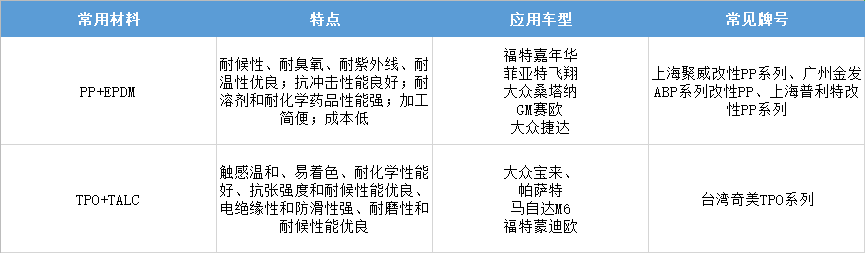 目前常用的外飾材料有 PP(聚丙烯)、ABS(丙烯腈-丁二烯-苯乙烯塑料)、ASA(苯乙烯、丙烯腈和壓克力橡膠共聚)、POM(聚甲醛)、PA(尼龍、聚酰胺)、PC(聚碳酸酯)、PE(聚乙烯)等,但具體到每一個(gè)零件所使用的材料又有所不同,以下針對(duì)具體的零部件系統(tǒng)介紹材料的選擇和應(yīng)用情況。