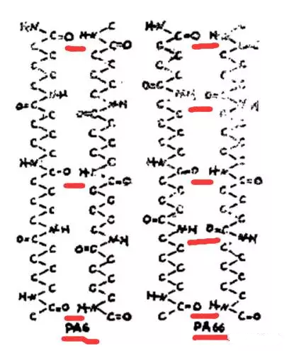 想要分析他們有什么區(qū)別,就要先從他們的結構入手,大家都知道,PA6是由己內(nèi)酰胺開環(huán)聚合而成,而尼龍PA66由己二胺與己二酸縮合聚合物得到。PA6與PA66具有相同的分子式,但是結構式不同,而正是由于這點差別導致了其性質的不同,如分子間氫鍵作用力不同。