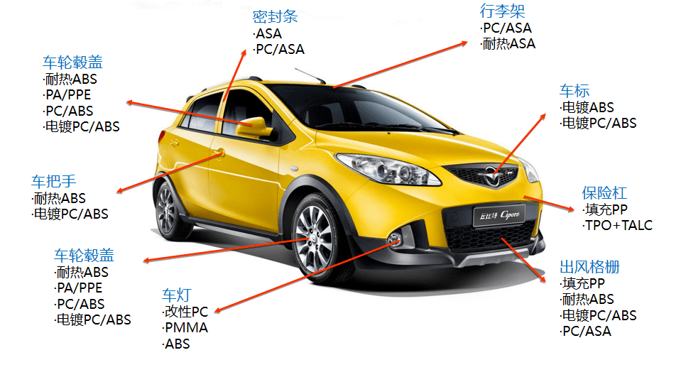 目前常用的外飾材料有 PP(聚丙烯)、ABS(丙烯腈-丁二烯-苯乙烯塑料)、ASA(苯乙烯、丙烯腈和壓克力橡膠共聚)、POM(聚甲醛)、PA(尼龍、聚酰胺)、PC(聚碳酸酯)、PE(聚乙烯)等,但具體到每一個(gè)零件所使用的材料又有所不同,以下針對(duì)具體的零部件系統(tǒng)介紹材料的選擇和應(yīng)用情況。
