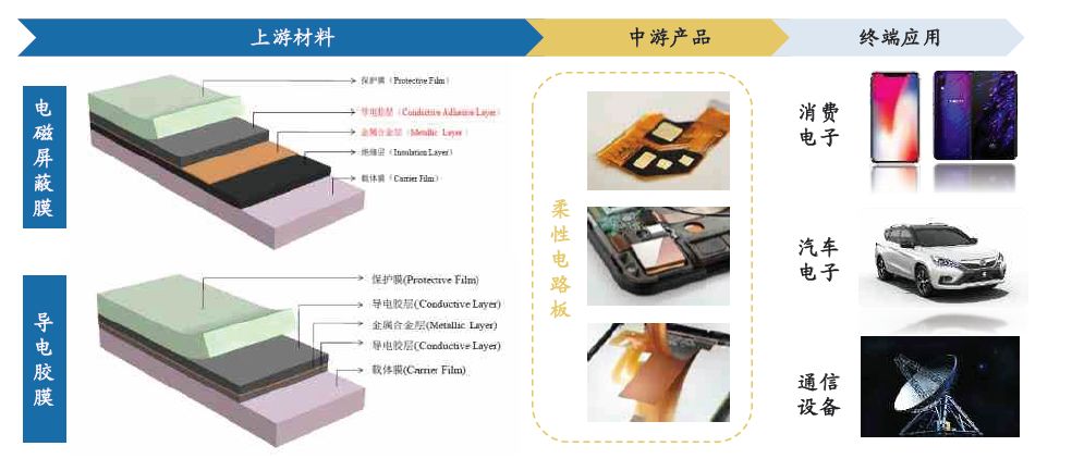 5G 時(shí)代由于高頻高速的通信需求,對(duì)智能手機(jī)內(nèi)部的電磁屏蔽需求也產(chǎn)生了增量需求,而在FPC 上依次壓合覆蓋膜、電磁屏蔽膜成為解決電磁屏蔽問(wèn)題的重要方案,廣發(fā)證券預(yù)計(jì)伴隨軟板化趨勢(shì)和5G 時(shí)代的需求,對(duì)應(yīng)屏蔽膜的廠商有望獲得加速成長(zhǎng)。