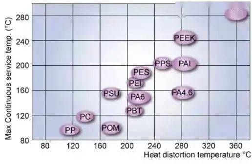 ▲ 填充30%玻璃纖維的聚合物的最大工作溫度和熱變形溫度